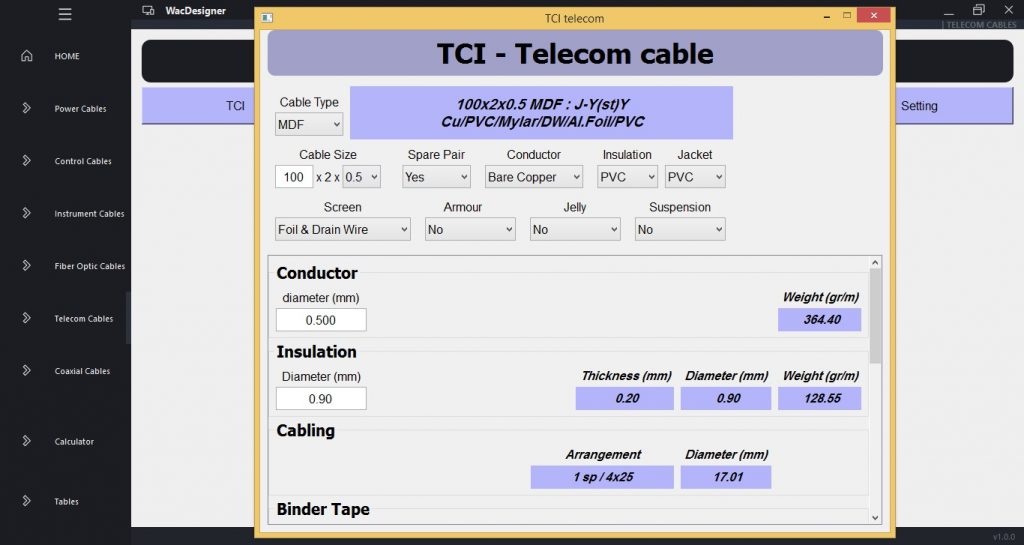 Then you can change all cable parameters, then after any change all cable’s dimensions and weight will be automatically recalculated and shown again inside scroll.